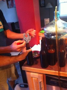 In what is still one of humankind’s greatest accomplishments, this mixture magically became beer. Following the instructions from the Bald Brewer, we then  siphoned it to a second 5-gallon container and let it sit for a couple more weeks. Then it was time to put it into the bottles.