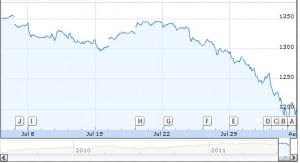 Stock market watchers like myself have had an entertaining couple of weeks recently. Amid lots of dramatic economic and political news, the S&P 500 index has dropped from a July level of 1356 down to 1199 (as of Friday August 5th). This 157-point drop works out to almost 12 percent of the value of  the index.