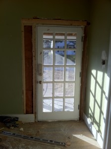 Wider front door (acquired used for $20!), just after it was installed into new framing