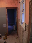 Bathroom wall, with hole for new second doorway framed inNew bathroom sink and table, made out of antique sewing table found for $20 used
