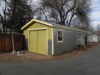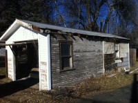 Tragic garage! Roof was slowly rotting away due to missing shingles. 1000 abandoned wasp nests plus and vines growing in rafters.Same garage with very barebones upgrades: paint, siding (not quite done in pic), and the $4 windows from Re/Store