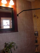 The bathroom was by far the worst room in the house. Several ladies ran from it while holding their hands over their mouths to prevent vomiting. This picture, while taken after I had removed the old fixtures, still represents approximately how shitty it was.The new bathroom is quite nice, but I still don't have any great pictures of it - it was too full of towels and toiletries to photograph on this day. But here you can at least see the custom shower curtain I welded up to match the shape of the tile showerpan I had built.