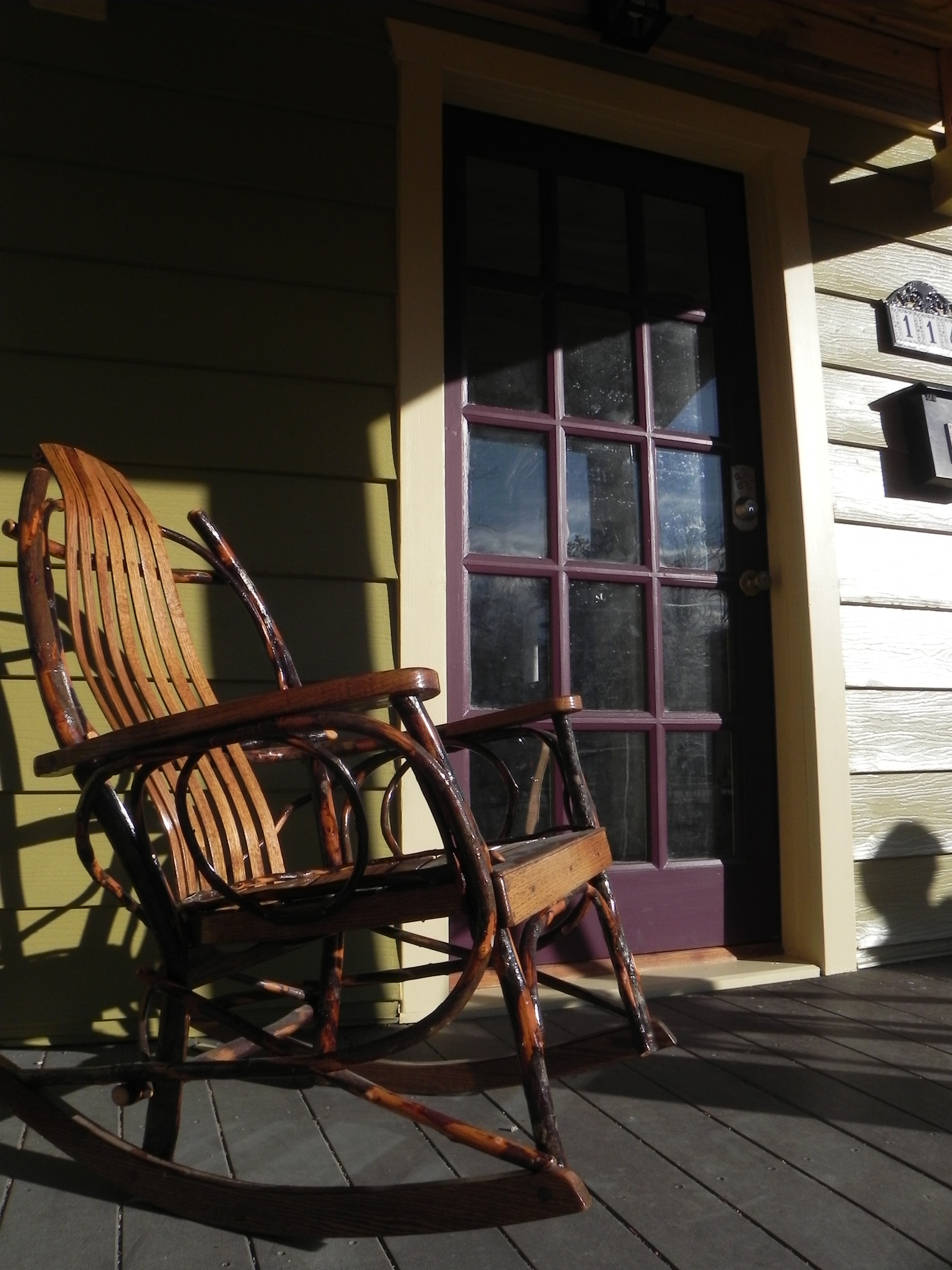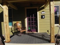 Old front door, complete with foreclosure noticesNew front door ($20), with new trim, beadboard ceiling, nice posts, sweet rocking chair, etc.