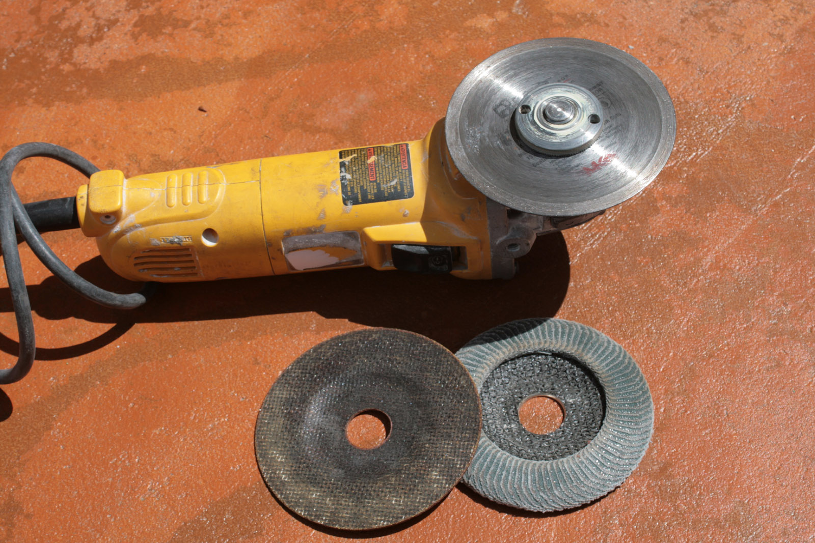This is the official Mr. T. tool. Its a dead-simple handheld rotary tool that simply spins a 4.5″ disc around extremely fast (about 11,000 RPM). The disc has rough parts that hit the steel at high speed and cause it to break off in dust-sized pieces. Because of the energy involved in each tiny collision, the broken fragments are instantly heated to white-hot temperature, so they appear as a glorious shower of sparks that shoots across your workshop, lighting it up like a KISS show. The sparks aren’t as dangerous as they look – they will bounce off a flannel shirt and extinguish themselves before they even hit the floor. But you still don’t want to grind steel in the presence of exposed gasoline or other flammable things. Also, don’t use your grinder with the blade guard and side handle detached like I do. It’s much more dangerous like that.