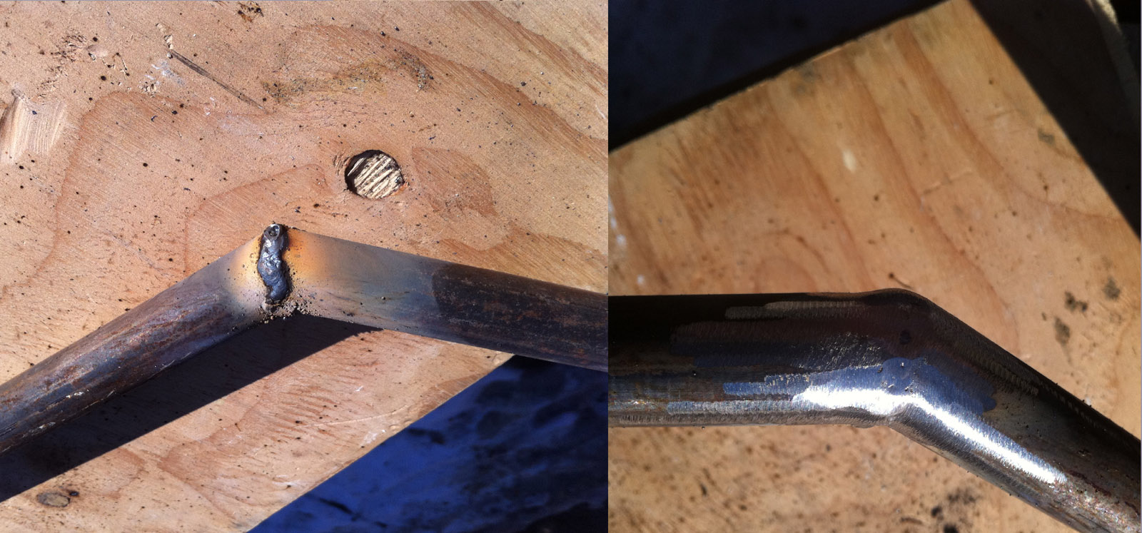 After your joint is complete, it will need quite a few minutes to cool back down before it’s safe to touch (since you had it at over 2000 degrees F while welding). But even before cooling, the joints can be smoothed with an abrasive wheel on the grinder, or buffed to a nice shine with a spinning wire wheel brush (on grinder or cordless drill). Here’s an example of a rough joint just after I welded it, and the same joint after a minute or two with the grinder: