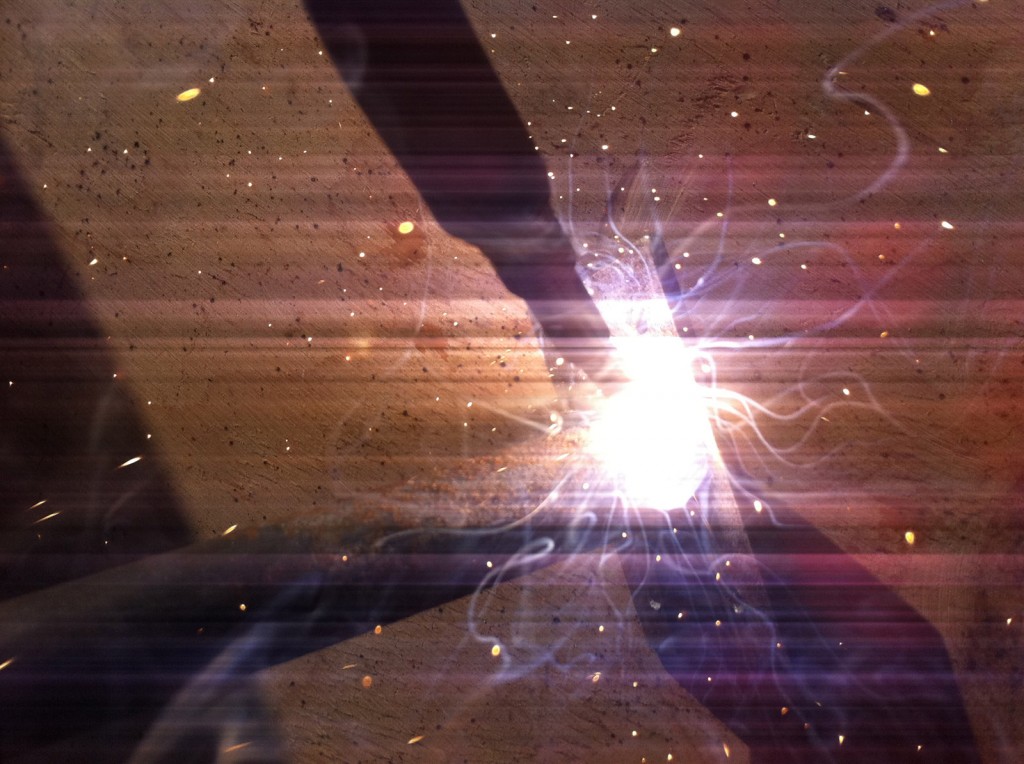 3. Lower your visor, position the gun, brace yourself and squeeze the trigger. You’re welding! Sparks are flying, a quiet sparkling firecracker sound emerges from your work, and a small amount of hot smoke is swirling about. You see the small orange pool of molten steel forming at the tip of your gun. You keep squeezing, and slowly move the gun, which makes the pool of liquid metal spread along the joint. The area you left behind rapidly cools, and becomes a strong bond. The more slowly and accurately you control your liquid pool, the better the quality of your welding.