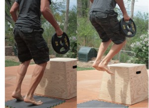 And it can be scaled to any degree. You can build a 12 incher or a 30 incher. I made a 20 for this article because it’s comfortable for most moderately fit people. If I want to make the exercise more strenuous, I just hold a pair of 25 pound barbell plates during the jump, as shown in the pictures (this also adds a bonus upper body component to the exercise as well).