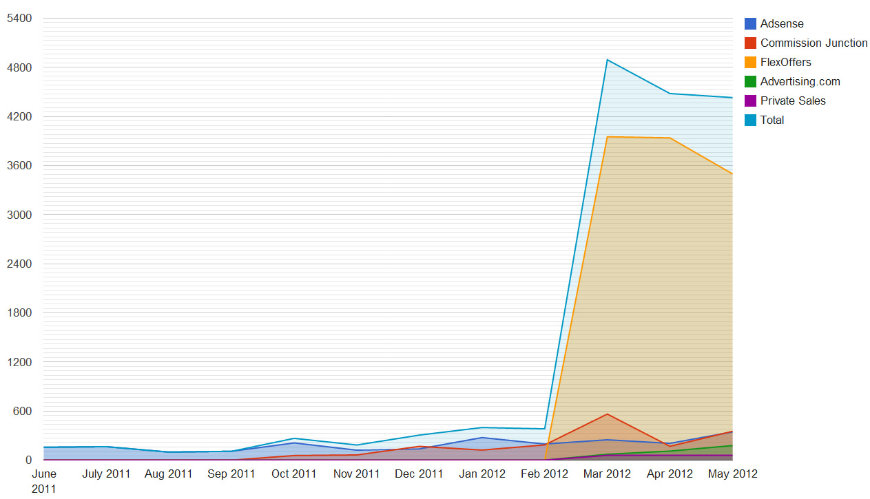 I watched my growing Flexoffers account balance warily. Was this ridiculous stream of money for real? Was it really going to come to me? When would it stop? What does a shitload of extra money mean to a man who has already happily realized that he has no real use for way more money?  I started planning an article to tell you all about it – you might have noticed the title “This Blog is Raking in some Serious Dough.. here’s how” in my list of draft articles. Here’s what the revenue stream looked like since the beginning of Money Mustache Time: