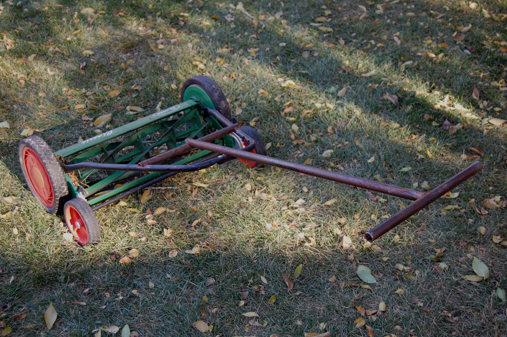 If you’ve ever read Muscle over Motor, you know I’m a big fan of the olde-fashioned Reel Mower for cutting the grass. I’ve used a relatively junky one for years, but this year I scored a dramatic upgrade from a surprising place: the trash bin area in the alley behind yet another neighbor’s house. This really good mower was being tossed simply because the low-quality steel handle had broken. After checking with the neighbor that they indeed did not want it, I brought it home, fired up the welder, and created a much stronger and more (cave)manly-looking handle for it. Since then, my mowing duties have been a breeze, and the mower itself draws many an envious eye from the other men on my street, who are still stuck sucking the fumes of their gasoline mowers and leaf blowers, the lawncare equivalent of a catheter and a bedpan.