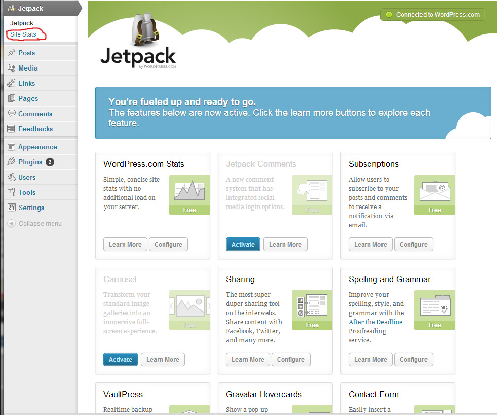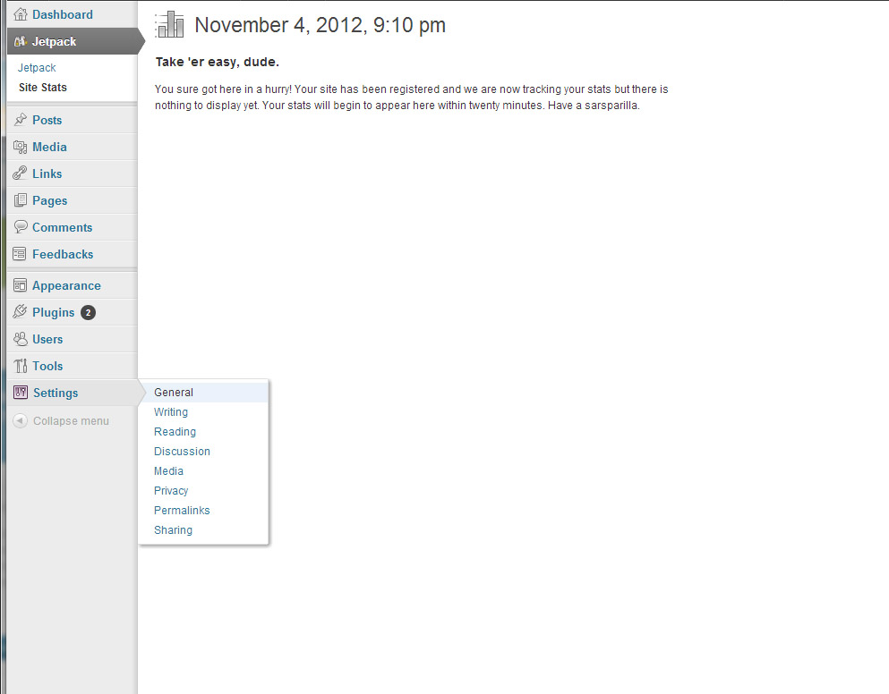 Once you have an account, you can authorize Jetpack and you will see a new option under the left hand menu for “Site Stats”. Your site stats will start to display in a little while, although at first you will get a “Take ‘er easy, dude.” message.