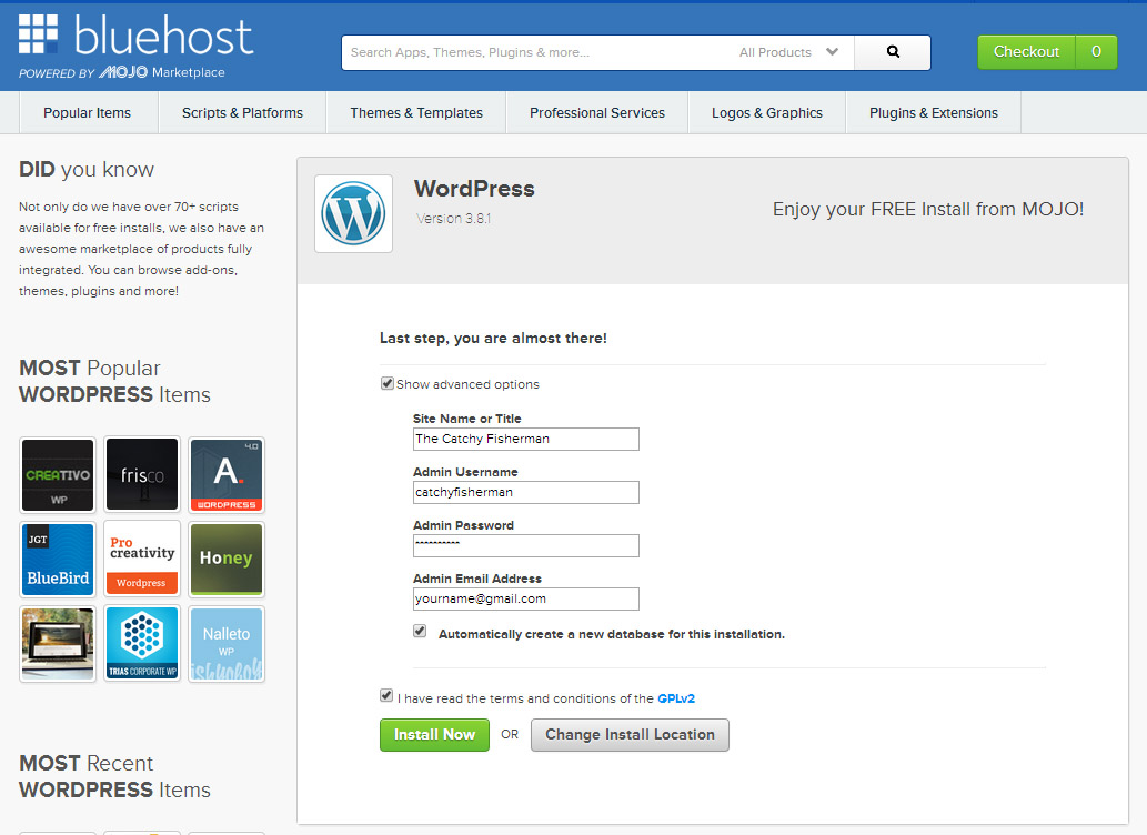 Step 3b – For the last step, check “Show Advanced Options” and see what’s there. You can change this information if you like. Leave the “automatically create a database” box checked. Check the terms and conditions box and click “Install Now”.