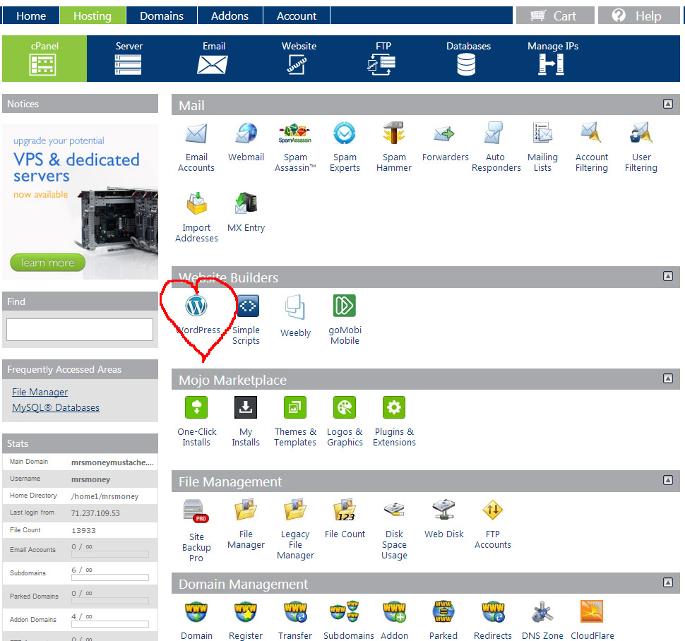 I’ve grown pretty content with Bluehost hosting. People keep telling me, “Man, you can’t run a site as big as Mr. Money Mustache with shared hosting! My site is 10 times smaller and I upgraded long ago!” But after upgrading to their “Pro” service and running some speed tests, I find that we still have capacity to spare, even with over 1.5 million pageviews per month, and often more than 200 simultaneous readers clicking away. Although a costlier hosting plan may still be in the cards after additional growth, I’m amazed at how much output we’re getting right now. The biggest benefits, however, are just in the ease-of-use of using a bigger provider like this: