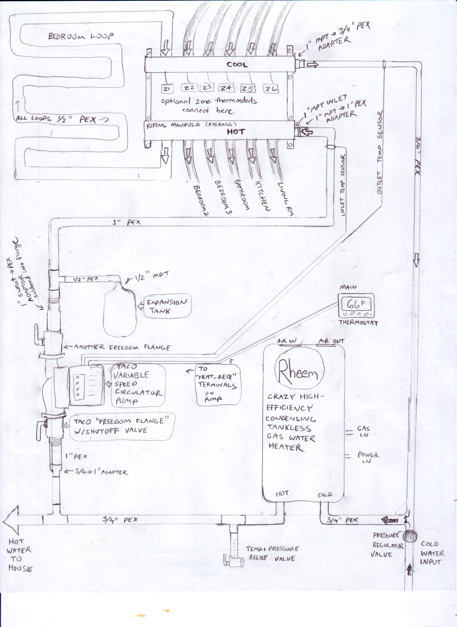 You could also make your own manifold using a larger diameter copper pipe, such as 1-1/2″ dia and branch off to 3/4″ dia for each zone. This is how my radiant system is designed. I also used high reliability, multi-speed, quiet Grundfos circulating pumps; one for each zone (with their own thermostats). I’d also suggest using a larger diameter 7/8″ PEX tubing as it affords a higher heat transfer per foot (to square foot of living space above) and is a lower resistance to the circulating pump so longer lengths can be employed. I used a Polaris 97% efficient hot water tank instead of tankless. Tankless can be great for vacation houses where there are days of no use. But in a primary house where hot water is used daily, the standing loss is small with an insulated tank and the benefits of tankless will not be evident in actual operation. (Much like a turbocharged 4-cyl IC engine; there is no cost savings when your foot is always pressing into the throttle.) And never use a boiler with radiant…boiler temperatures are too high.
