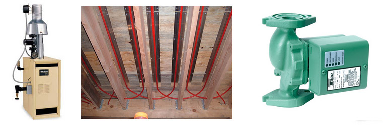 So how do we build one of these systems? In a nutshell, you need something to heat the water (sometimes called a boiler), a network of tubing under your floor, and a pump to circulate that water through all that tubing: