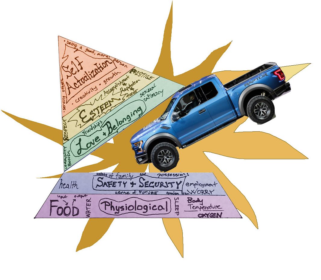 That’s an obvious example, but it translates to something much more emotional: the car. Upgrading the reliability of your car might indeed provide an increase in life security. Likewise, getting a more efficient car boosts your financial security, while also providing the self-actualizing benefits of “being less of an asshole to other people”. However, most car purchases are done for the opposite reasons – initial thrills aside, a full-sized pickup truck will bring only pain in the long run.