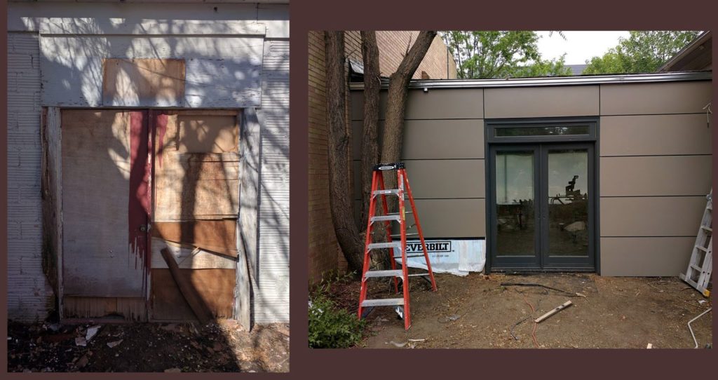 Figure 1: Replacing the Infinitely Shitty “doors” to the back yard and future patio, with a reasonably fancy unit I rescued from another builder via Craigslist. I also added some foam insulation and some repurposed siding – leftover materials and design ideas from last year’s backyard studio project. Just one of about 100 similar-scale improvements this building needed.