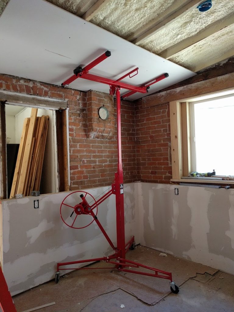 We found lots of cool ancient brick under the other coverings. Here’s a scene from when I was trying out the new drywall hoist to install the kitchen ceiling.