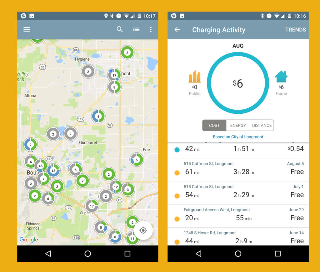 Charging map for Longmont+Boulder and some of my recent charging activity (mostly free!). Ignore the charge times – in many cases the car reached 100% and just sat there until I picked it up. You get about 25 miles of charge per hour on public “level 2” stations, and peak rate of almost 200MPH on a Level 3.