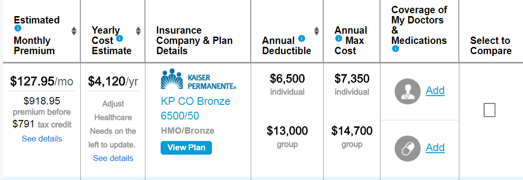 Figure 1: My new insane medical insurance premiums for the minimum available “Bronze” program, with a $6500 deductible.
