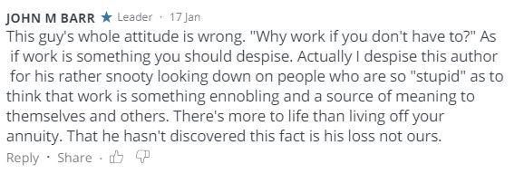 The people who lob this “retirement is bad” complaint against us are often the lucky ones – a professor who loves researching and teaching, or an established doctor who loves saving lives and happens to enjoy the work environment she has created for herself. But in real life, over half of people are in jobs they genuinely do not enjoy, and which they would immediately quit if they didn’t need the money.