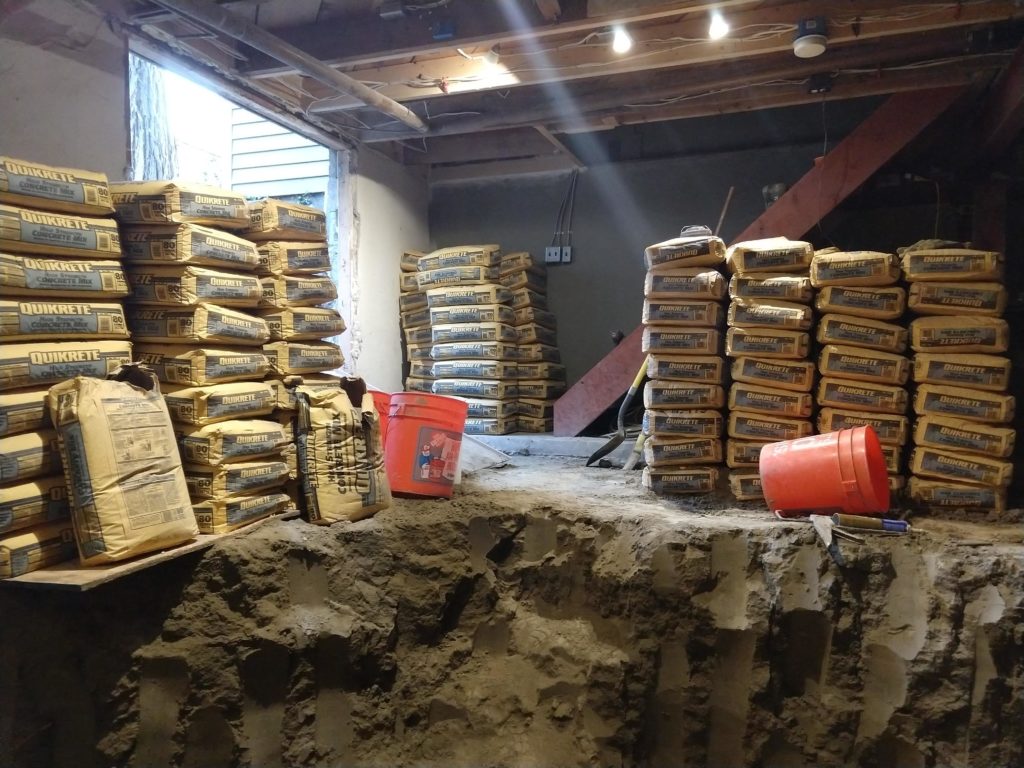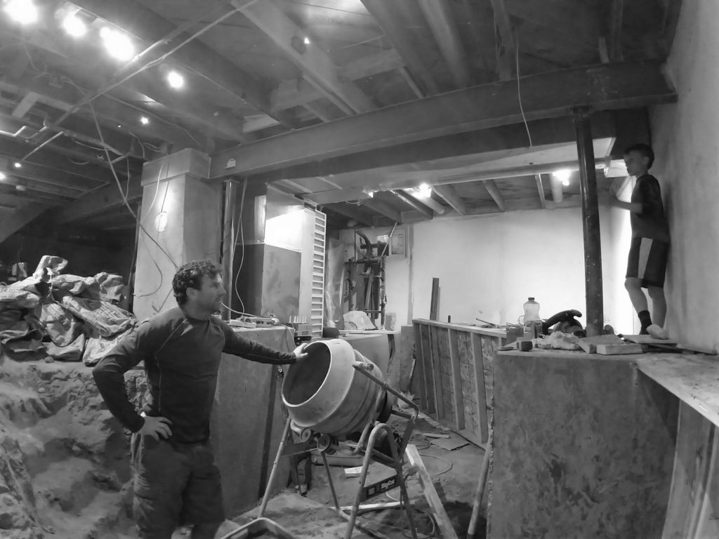 Luc takes a brief rest from digging out 30 tons of dirt from his own basement and hand-pouring a new foundation while his son supervises.