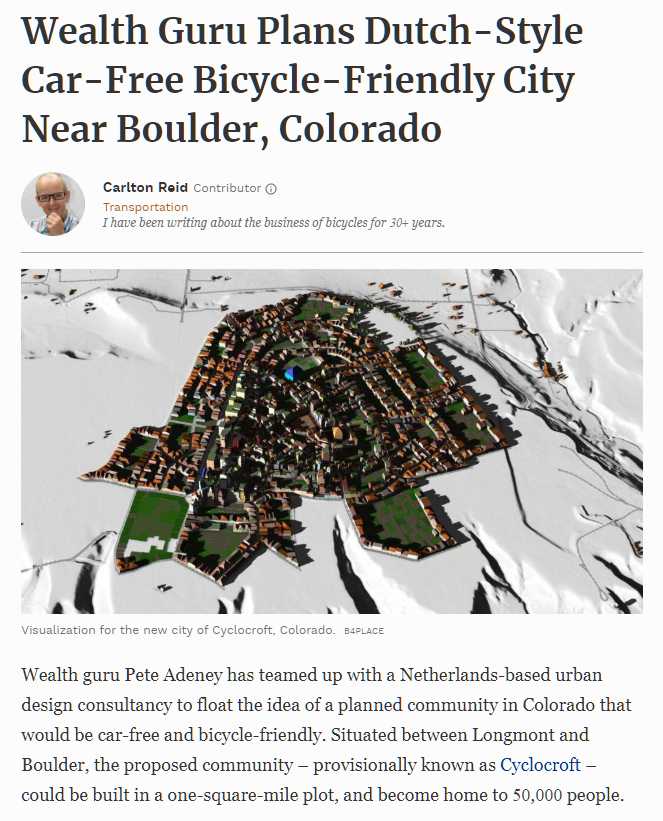 Forbes – Wealth Guru Plans Dutch-Style Car-Free Bicycle-Friendly City Near Boulder, Colorado