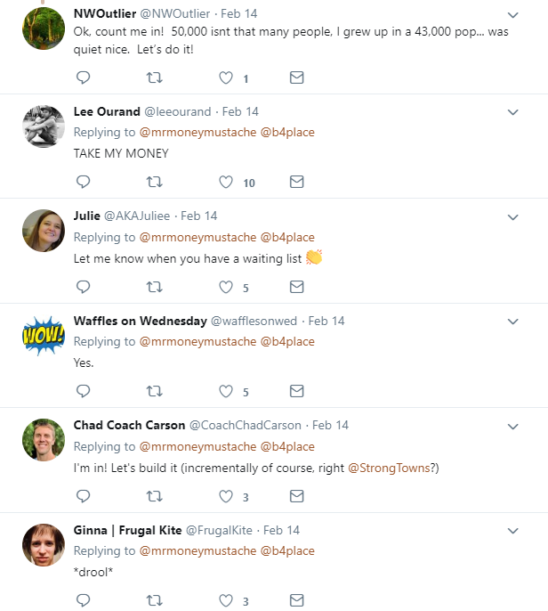 First, you are a connector. As shown by how this story blew up, you have a community (both here at MMM and the wider FIRE community) that you can tap into. You have the ability to bring together some folks who are both capable and interested in “being a property developer” and “doing the work”. I think it takes someone like you with the vision, the connections (whether you realize it or not), and the ability to tell the story to bring together “chief marketing officers” and “Forbes writers” and city planners, and politicians, and a huge number of folks who would not only be willing to do the work, but who would want to move in, live and work there.