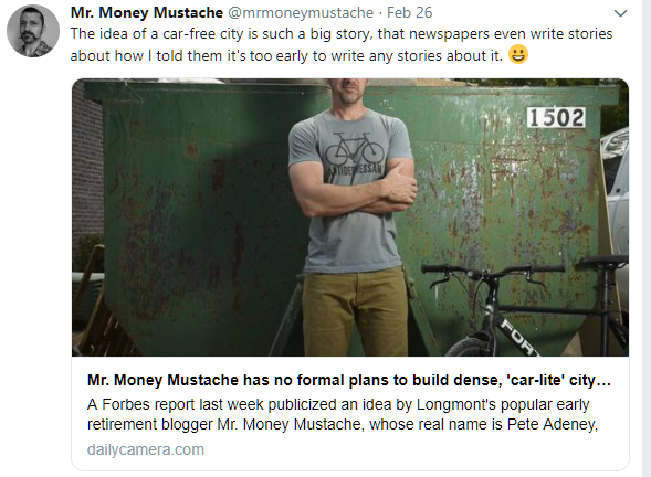 Boulder Daily Camera – Mr. Money Mustache has no formal plans to build dense, ‘car-lite’ city between Boulder, Longmont
