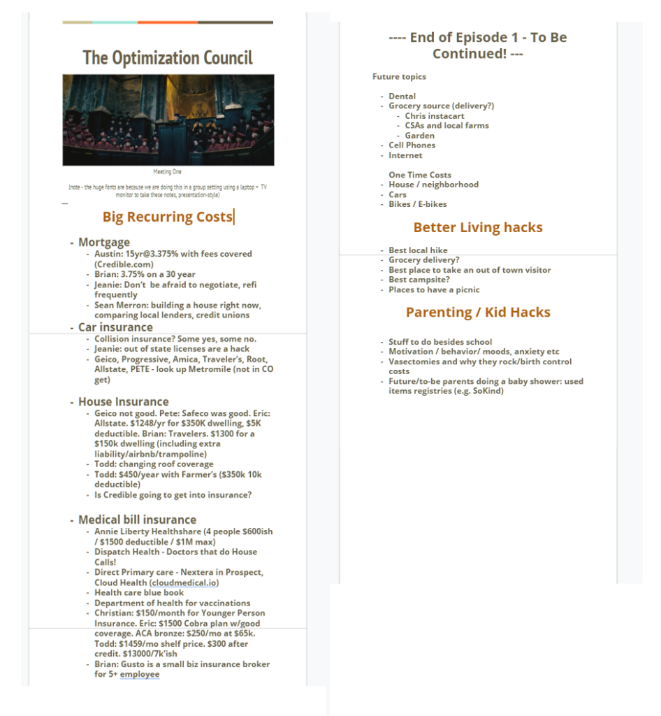 The Council would meet every now and then to talk through life’s biggest expenses and opportunities, and harvest the wisdom of the group so we can all benefit from the best ideas in each category.