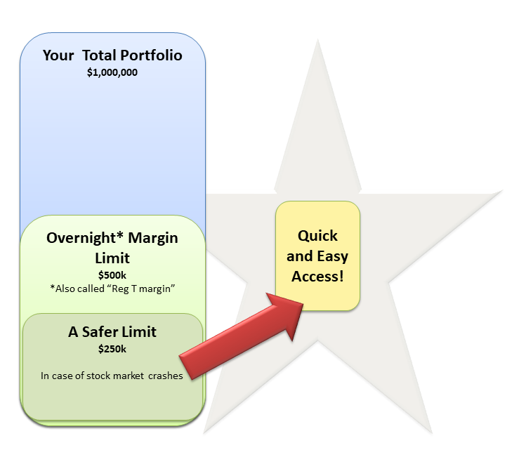 With the margin loan option now in place, all of these fears disappear. I can now safely remain fully invested, and in the unlikely event of one of those “emergencies” above, I can just pull out any amount of money I might desire. No delays, and no taxes.