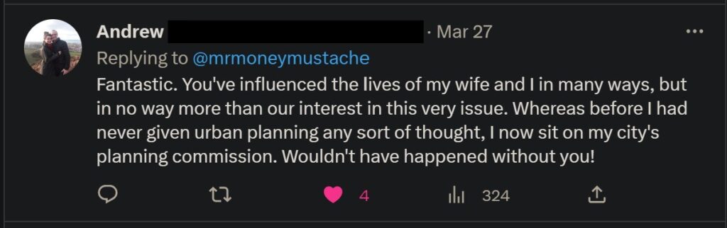 • If you’d like to make your own city a better place to live, just start emailing your own city council, or even better, sign up to serve on your own local planning board or city council yourself, as the heroic gentleman from Twitter did above. The things to push for are: approve more housing and more bike paths, but eliminate minimum parking requirements and above all stop wasting money on road expansions! Every dollar spent on accommodating cars subtracts many dollars from the future wealth of your city.