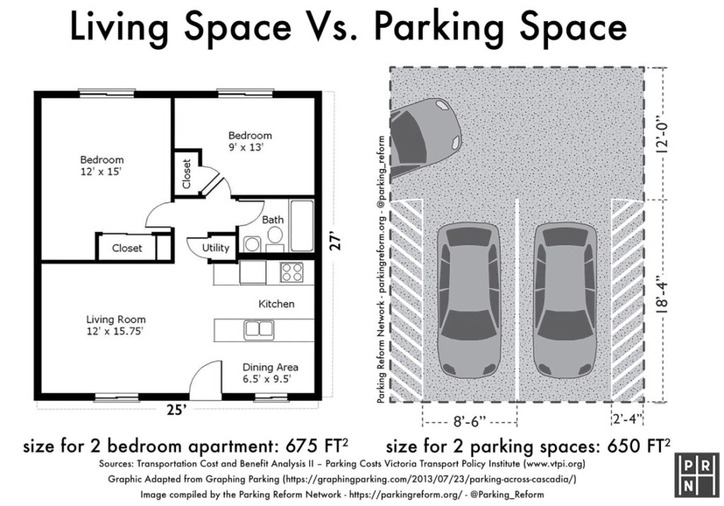 This is just the beginning of the insanity, because I have only shown you two parking spaces and one intersection. The reality is that our entire cities are made almost entirely of stupid, expensive wasted space like this.