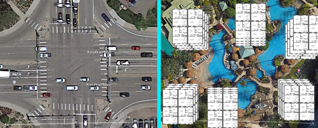 WHAT?! So every time you have two big car roads intersect, which happens hundreds of times in every big city, you are wasting enough space to build a luxurious, resort-like living area with about one hundred two-bedroom apartments and still have room for a pool, a dog park, a grocery store, a couple of restaurants, and so on.