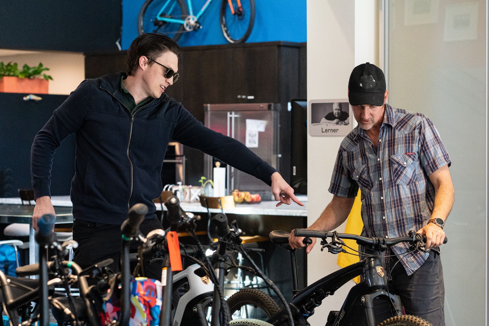 Checking out one of the 60+ Electric Bikes at the HQ of the country’s first car-free neighborhood.