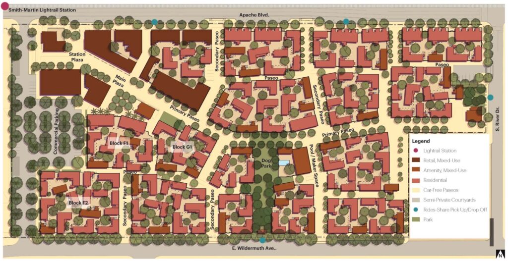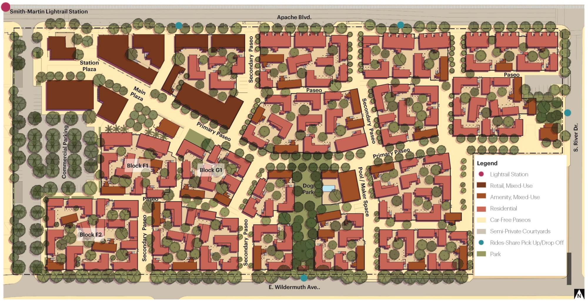 An early sketch from Culdesac’s architecture firm, Optico Design. Isn’t it amazing what you can fit in a single Big Box shopping center parking lot?