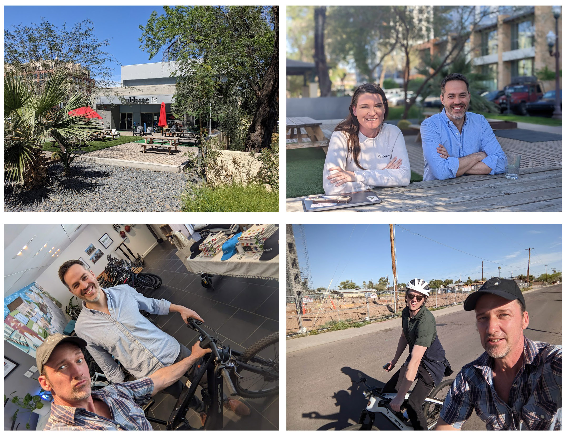 Clockwise: Culdesac office replaced their own parking lot with a mini-park. Culdesac head of marketing Blythe Ingwersen and co-founders Jeff Berens and Ryan Johnson showed me around and lent me a nice Porsche e-bike for a tour of the city!