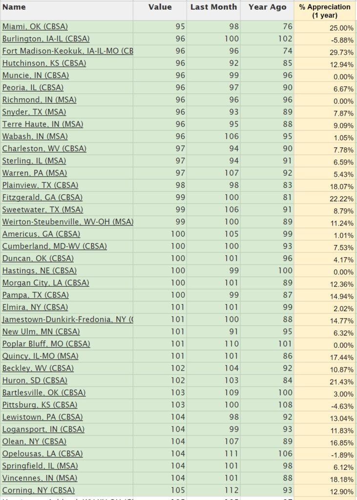 Just for fun, I pulled the data from that same FRED website into a separate google spreadsheet (which I’ll share here) and sorted it by cost per square foot. Then, I highlighted a band of affordable cities with housing centered on the $100 per square foot range, which would mean a 2,000 square foot house is about $200k.