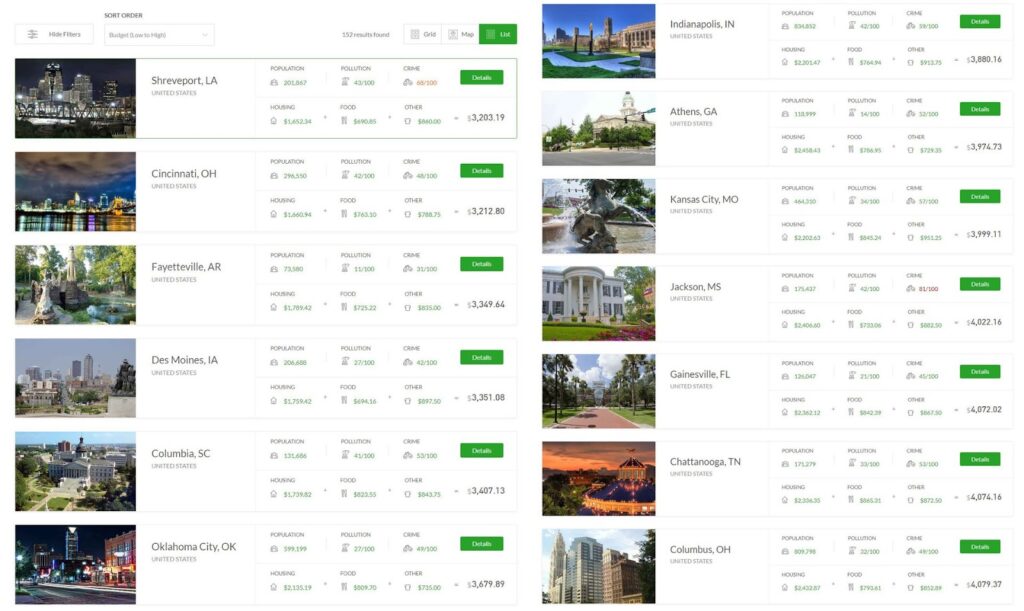Hey, that’s interesting. I like how the site shows the population right on the main list, because that provides a big clue to the “feel” of a city. I personally like the feel of a 50k-200k person town, so I might look into Fayetteville, Columbia or Athens. I’ve also been to Chattanooga and really like that place – who knew it was only about as expensive as Columbus Ohio?