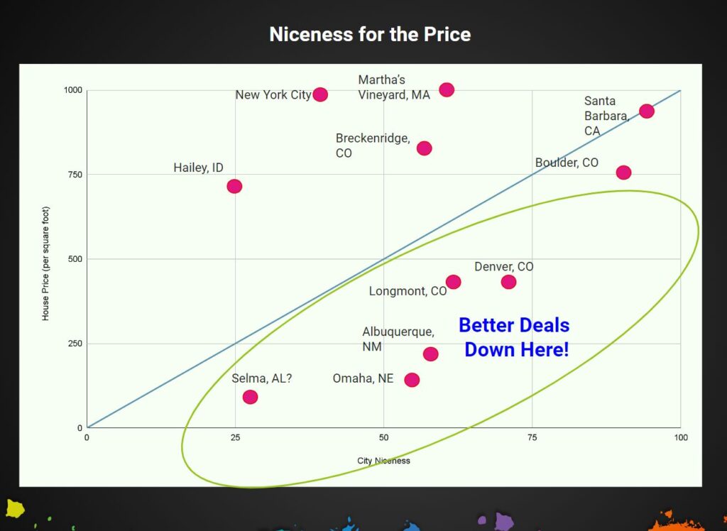A chart like this is just a starting point – you’d need to read more about any place and then go visit in person before considering a move. But the idea is to start with data, and then do some fun research based on what you learn.