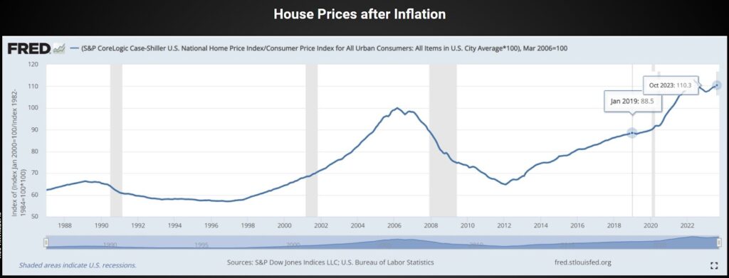 As with any question, let’s start by looking at the data: how much have US house prices actually risen – adjusted for inflation – since 2019?