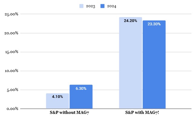In the case of the current stock market euphoria, not exactly. Because if you dig into the share prices of the 500 big companies that make up our famous S&P 500 index, it turns out that almost all the recent growth – about three quarters of it – came from just the seven biggest companies, known as the Magnificent Seven: Apple, Nvidia, Microsoft, Amazon, Google, Facebook, and sometimes Tesla.