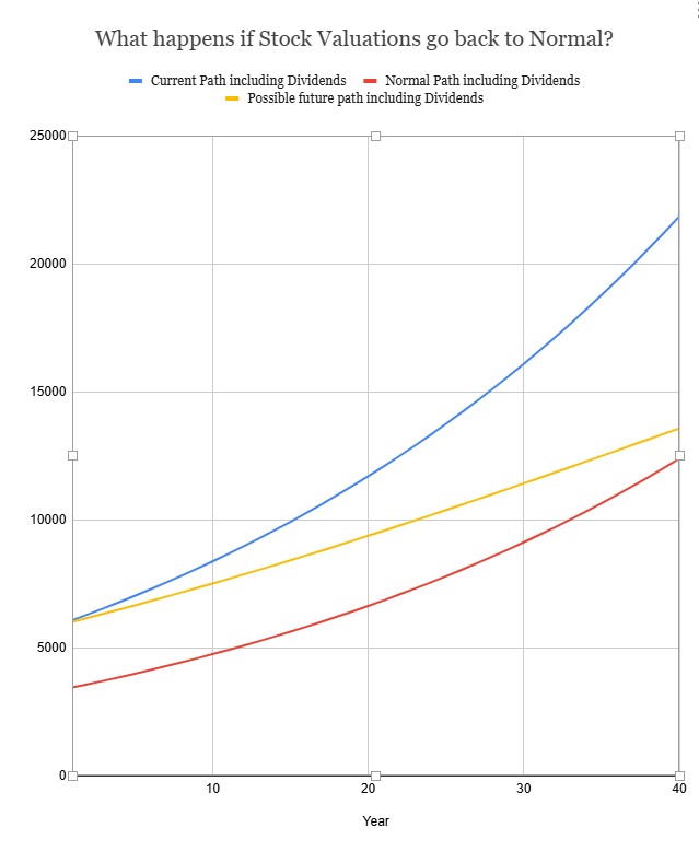 And over the long run, even if stocks return to more typical valuations, the end result would be something like the yellow line in this graph: