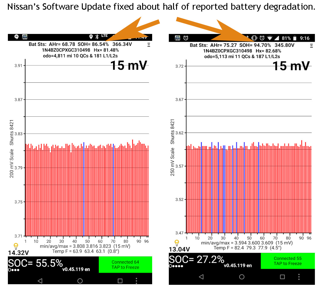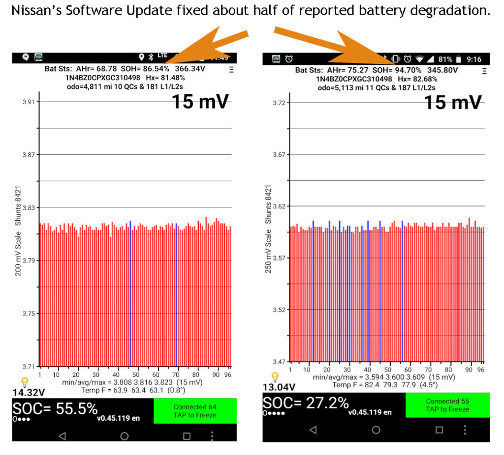 My car turned out to be fine after all. A year after ignoring my reports to them (and even unnecessarily replacing some brand-new packs under warranty!) Nissan discovered a software bug in their battery management system and issued a warranty recall. I got it reprogrammed at the local dealer at no charge, and this was the result.